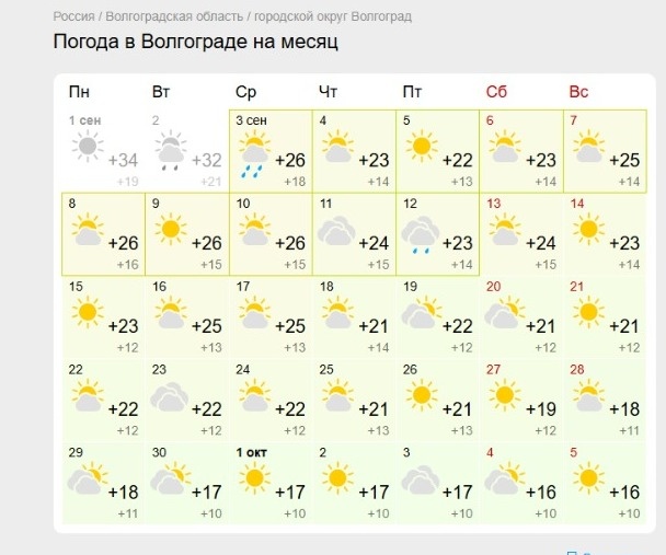 Сервис прогнозирует, что тепло попрощается с нами в два этапа. Затяжная малооблачная погода подступит к Волгограду ориентировочно к 18 сентября. К этой дате прогнозирует понижение дневной температуры до стабильных +21. Такой отметкой (лишь в некоторые дни прогнозируется до +22) будем довольствоваться до 26 сентября. После этой даты волгоградская погода возьмет верный курс на похолодание и на октябрь. Температура сначала резко снизится до +19 - +18. А на предпоследней неделе днем по прогнозам — до +17. Ожидаемо с такой температурой вступим в октябрь-месяц. Кстати, до конца этой недели будем радоваться отметке +25. В пятницу выглянет яркое солнце, в этот день ничто не обещает испортить прекрасную сентябрьскую погоду. На ближайших выходных — малооблачно. В следующую семидневку вступим с температурой до +26. И только к концу будущей неделе тепло очень медленно, почти незаметно, пойдет на спад — до +23.