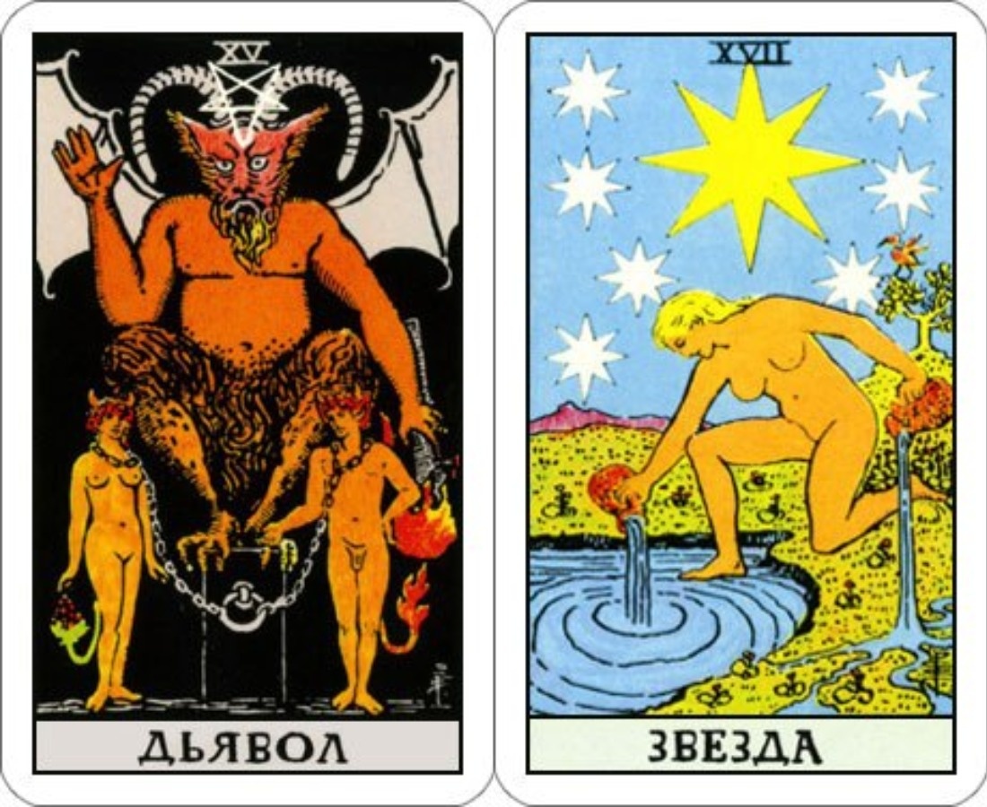Недавно в практике я заметила любопытный момент. В раскладах на отношения, где не было чётких позиций «прошлое – настоящее – будущее», стали снова и снова выпадать одни и те же карты: сначала Дьявол, а следом Звезда.