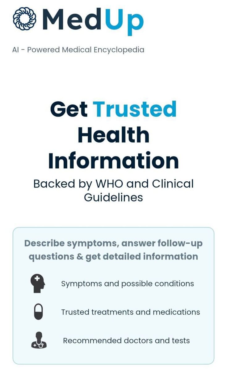 Гуглим симптомы правильно: новая нейросеть Med Up станет вашим личным ВРАЧОМ — поможет определить заболевание по симптомам, предоставит советы по здоровью и многое другое. • Самое интересное — Med Up ищет информацию только в проверенных источниках, одобренных ВОЗ, а не просто в Google. • Также доступны качественные медицинские материалы — БЕСПЛАТНО. • Удобный интерфейс с поддержкой русского языка. Проверяем здоровье здесь, но не забываем о настоящем враче!!! NeuroFlux #MedUp #Здоровье #Нейросеть #Медицина #ВОЗ #Бесплатно