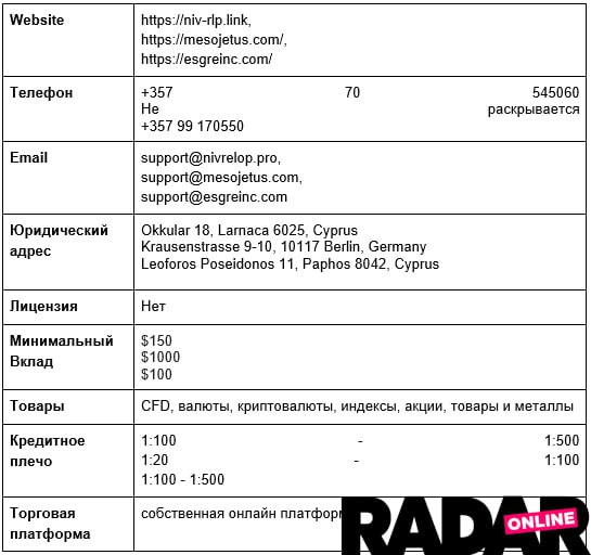 Несмотря на заявленные юридические адреса на Кипре и в Берлине, Nivrelop, Mesojetus и Esgreinc не имеют ни CySEC ни BaFin.