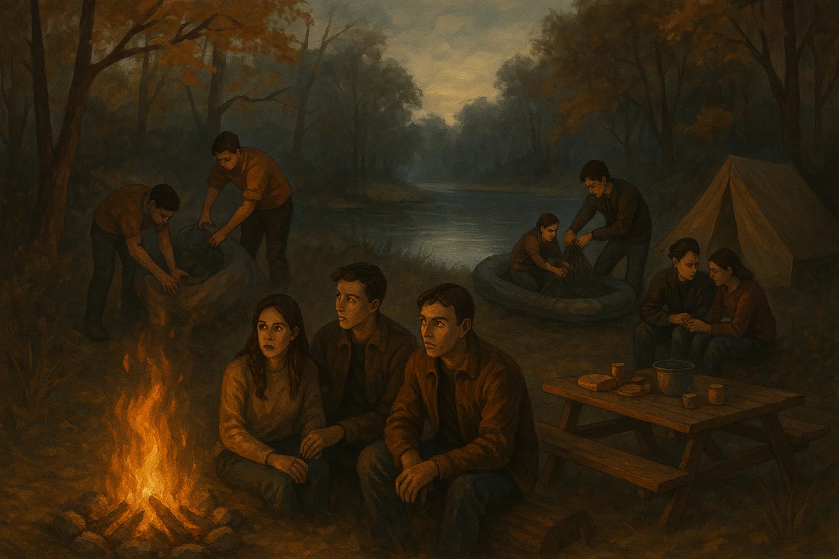 Мы принялись обустраивать стоянку. Юра и Настя, которые были неразлучной парой, с энтузиазмом взялись за разведение костра. Их слаженная работа выглядела почти комично: Настя подкладывала ветки, а Юра с серьезным видом раздувал пламя, будто совершал какой-то древний ритуал. Валера тем временем накачивал надувную лодку, напевая что-то под нос, а Олег сосредоточенно распутывал рыболовные сети и проверял удочки. Я же занялась импровизированным столом: расстелила скатерть на траве, разложила хлеб, овощи, соусы и, конечно, заветный контейнер с мясом для шашлыков. Каждый был занят своим делом, но в воздухе витала та самая гармония, когда всё складывается как надо.
