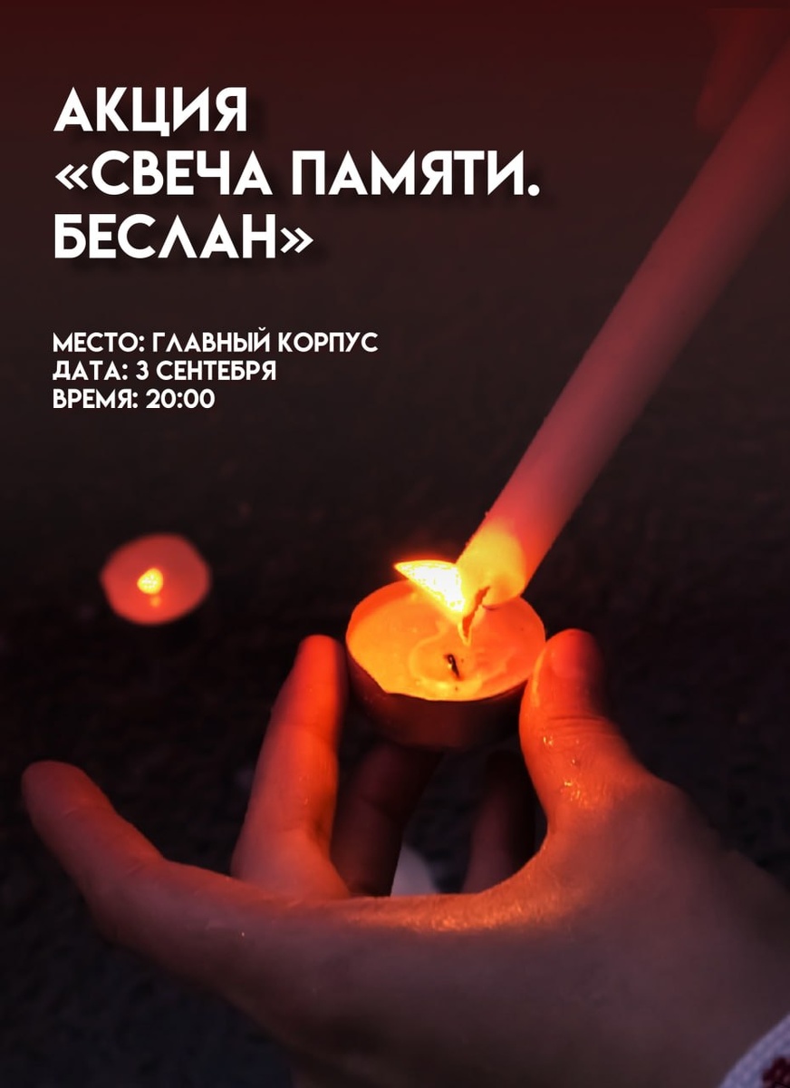 Акция «Свеча памяти. Беслан» в СПбГЛТУ 🕯 🎓 Студенты и сотрудники СПбГЛТУ, приглашаем вас присоединиться к акции памяти, посвящённой трагическим событиям в Беслане, произошедшим в сентябре 2004 года. В результате захвата школы №1 погибли 335 человек, включая 186 детей. Эта трагедия навсегда останется символом боли, мужества и единства. 📅 Мероприятие состоится 3 сентября в 20:00 у Главного корпуса СПбГЛТУ. Зажжём свечи, чтобы почтить память каждого пострадавшего 🕊