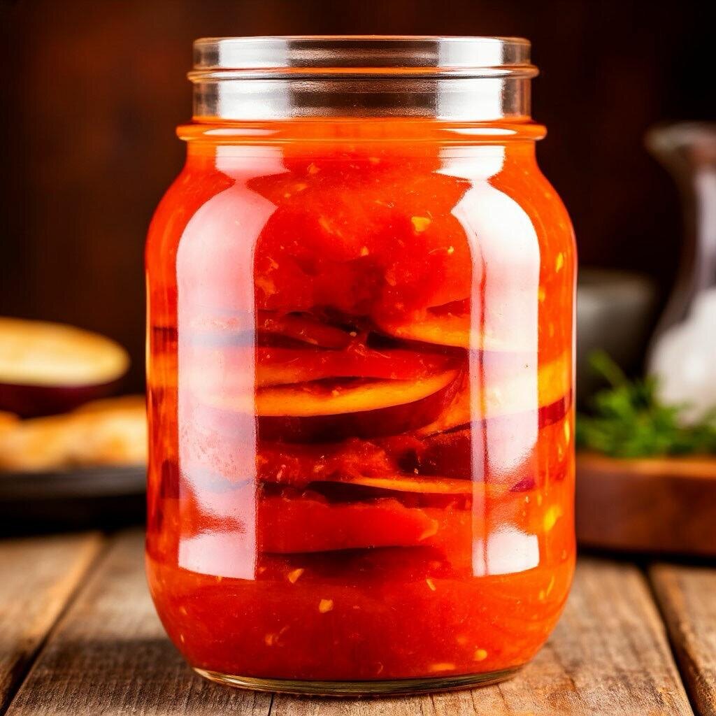 Половину помидоров нарезают кольцами, вторую пропускают через соковыжималку или мясорубку, чтобы получить свежий томатный сок. В стерилизованные банки укладывают овощи слоями: помидоры, баклажаны, перец, зелень и чеснок. Добавляют специи — черный перец горошком и лавровый лист — и только затем заливают томатным соком, дополняя солью, сахаром и уксусом по вкусу.