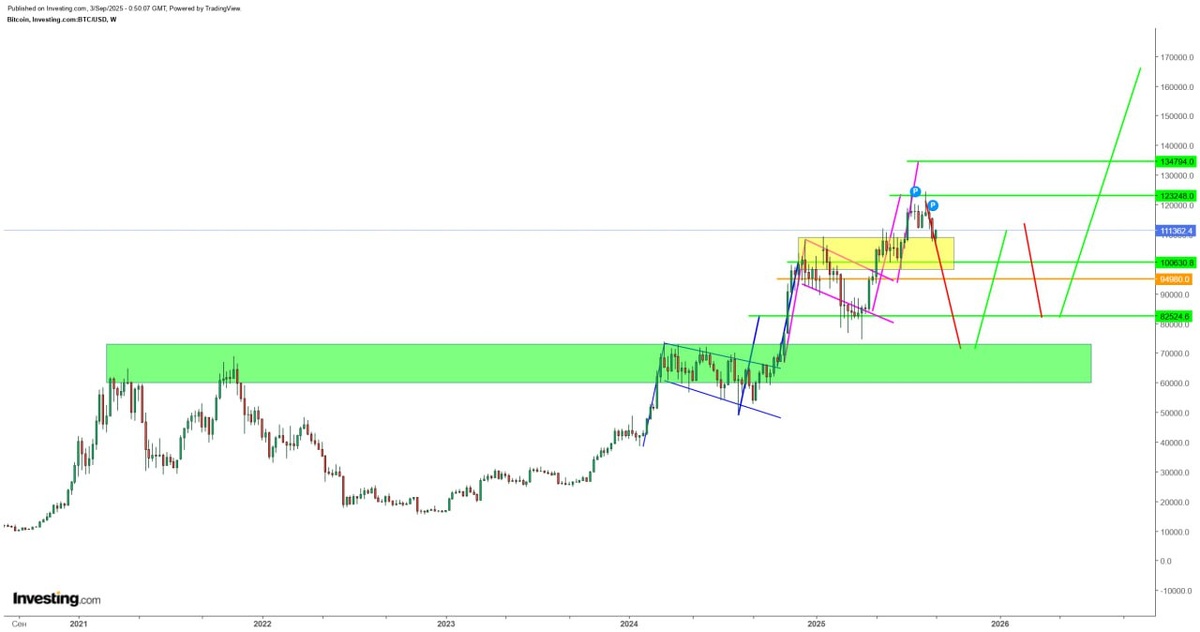 🍂 Всем добрый день и позитивного настроения! Крайний раз ситуацию с Bitcoin мы с вами обсуждали 13 августа А что же происходит сейчас и есть ли какие-то изменения ❔ 🗣 Ну во-первых как мы видим цена не может пройти уровень 120к$, хоть и прокалывала его дважды Причем если смотреть на график, то сливы на недельных свечах от хаев, очень некрасивые с точки зрения свечного анализа Два пинбара - это очень не красиво Во-вторых сам уровень 123к$ интересен тем, что по сути это уровень ФИБО, то есть 123%, а практически в любом инструменте он является сопротивлением Вот цена и не может его пройти Тем не менее она и держит поддержку 107к$ выше которой мы недавно покупали 🆘 ТЕМ НЕ МЕНЕЕ - РИСКИ ОБВАЛЬЧИКА и реализации картины показанной на графике - ОСТАЮТСЯ Надо пробивать 123к$ и закрепляться закрытием двух недель подряд выше уровня Тогда можно разговаривать о целях 🏹 131к$ 138к$ и 161к$ 🆎 Пока же мы осторожно оптимистичны, но держим негативный сценарий в голове, что и призываем делать всех -