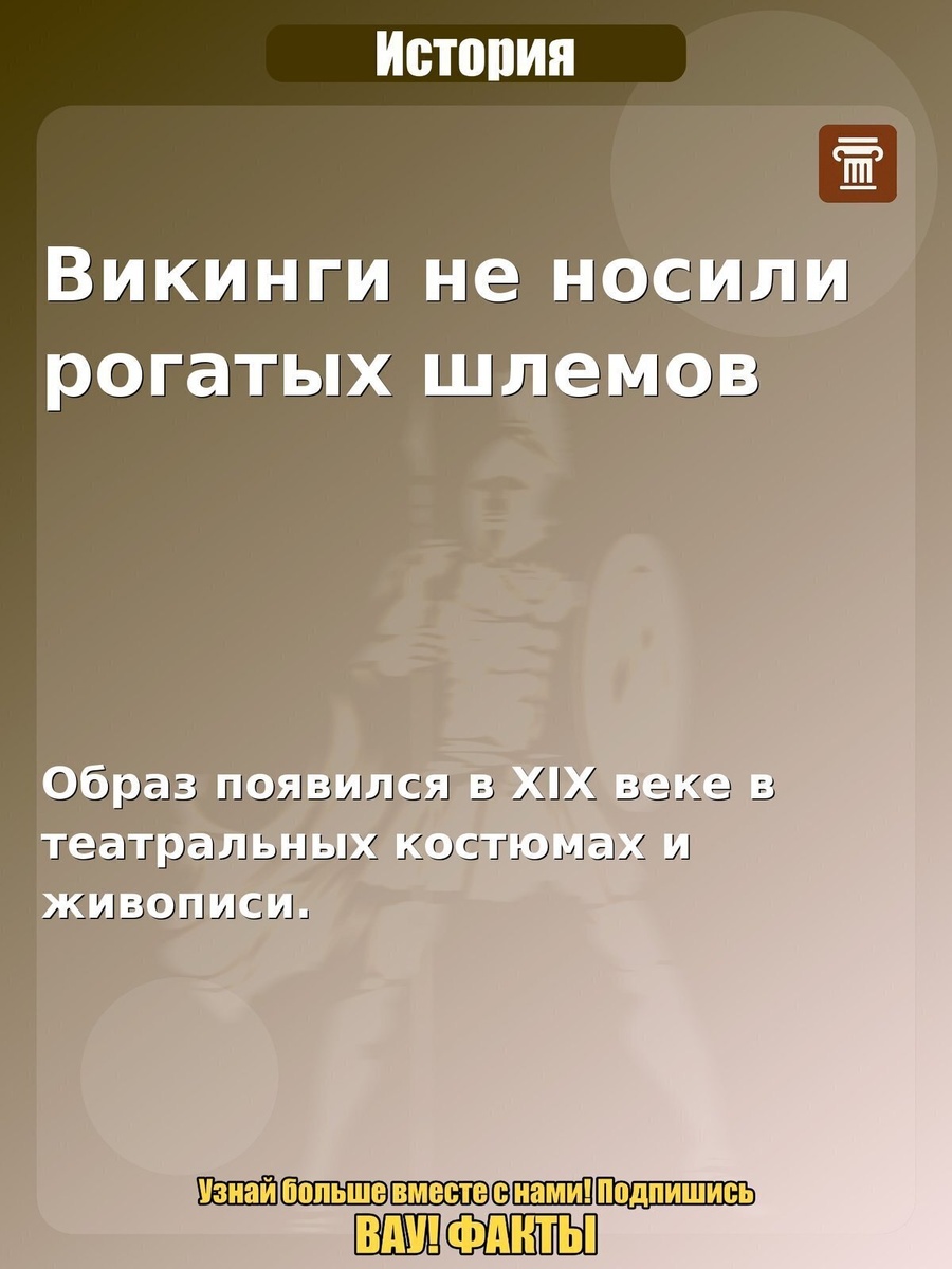 Викинги не носили рогатых шлемов. Образ появился в XIX веке в театральных костюмах и живописи. Интересный факт по теме «История»: Викинги не носили рогатых шлемов. Почему так: Образ появился в XIX веке в театральных костюмах и живописи.. Поделитесь в комментариях, знали ли вы об этом и стоит ли делать продолжение по теме. #история #факты #удивительно