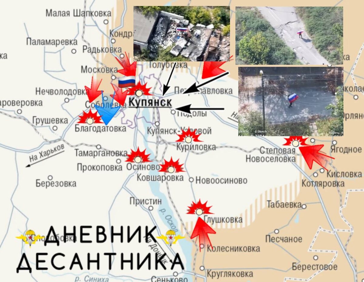 🪂 Купянское направление. ▫️МО РФ опубликовало кадры вооружения флага в различных частях Купянска. ▫️На участке Московка-Соболевка. Наши войска продвинулись западнее Московки, а также развили наступление с западной и восточной сторон у Соболевки. В саму Соболевку мы не зашли. В Соболевке противник попытался создать ловушку для наших бойцов, а именно: Оставили там как приманку несколько военнослужащих ВСУ, наши войска планировалось заманить ими для легкого освобождения Соболевки, а потом накрыть наши позиции ФПВ-дронами и кассетами, так как там отрытая зона. Хохлы просчитались, все их тактические действия мы знаем наперед. В целом, развитие наступления на противоположном берегу Оскола дает нам возможность отрезать группировку противника на участке Степовая Новоселовка-Ковшаровка, но противник оказывает ожесточенное сопротивление, плюс ВСУ длительное время готовили сам Купянск и береговую линию к обороне. Предстоят ещё ожесточенные изнурящие бои. ▫️ Дневник Десантника