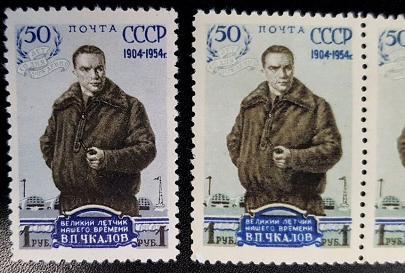 В рамках нашей жесточайшей борьбы с фальшивками сообщаем Вам новые данные и инструкции, как с ними бороться. Сейчас подленькие методы изготовления и распространения таких суррогатов перенеслись на относительные не дорогие выпуски. Сегодня мы разбираем экземпляры выпуска марки Чкалова (1954 год, каталог СК- 1661, Соловьева - 1747), и блока 1959 года Выставка достижений советской науки, техники и культуры в Нью Йорке (каталог СК- 2233, Соловьева - 2318). Оба эти примера очень показательны. Итак - Чкалов. Марка, которая на рынке с люксе стала встречаться не часто. Справа подделка. Нас сразу насторожил цвет марки. Хотя не имея под рукой настоящего экземпляра, можно и проглядеть подвох. Тем более, что нам был предложен на исследование квартблок. Переворачиваем на клеевую сторону. Вначале все кажется не плохо КЛЕЙ ИМЕЕТ "БЛАГОРОДНЫЙ" ЖЕЛТОВАТЫЙ ОТТЕНОК, КОТОРЫЙ ВСТРЕЧАЕТСЯ НА МАРКАХ ЭТОГО ПЕРИОДА, но глаз наш не обманешь. Клей явно не свой. И ЧТОБЫ ТАЙНОЕ СТАЛО ЯВНЫМ ПРИХОДИТСЯ ПРИБЕГНУТЬ К