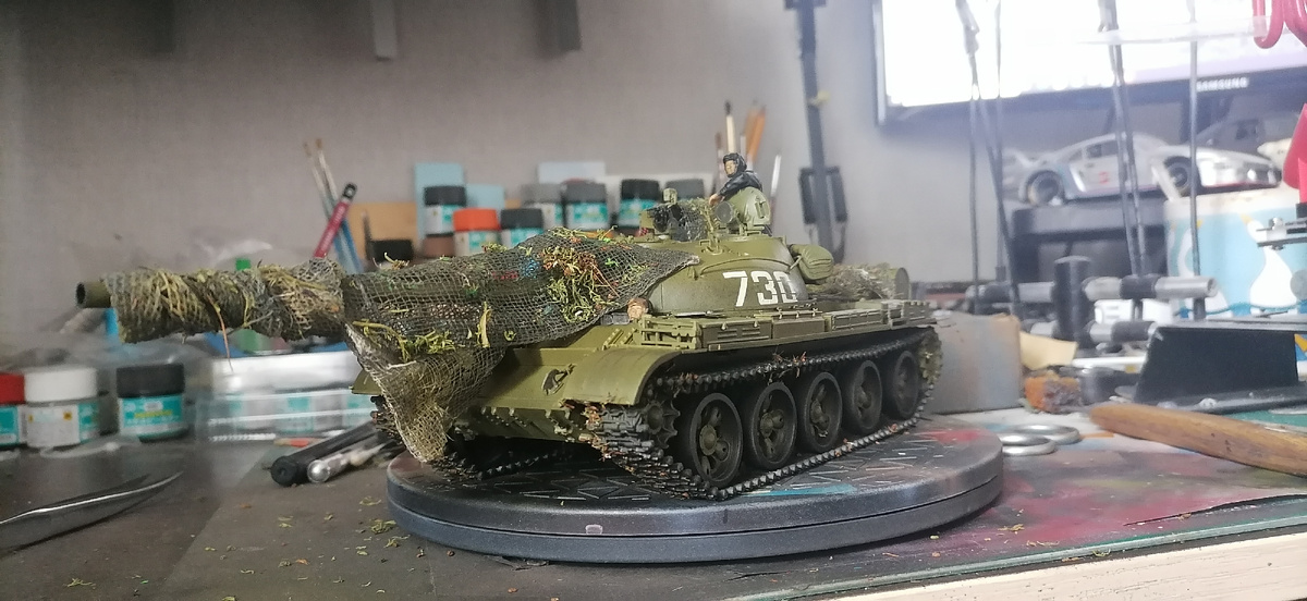 Всех приветствую! Собственно до финиша добрался и Т-62. Но не в том виде в котором я думал, спасибо моим коллегам-моделистам ибо надоумили меня не так давно попробовать сделать масксеть на него. Исторически так сложилось Что танк Т-62 стал последним средним танком, так же как и Т-10 (если не путаю) последним тяжелым. После них будет определение "Основной танк". Но к этому мы еще вернемся. Ну я и попробовал. Получилось вроде вполне реалистично. В общем опыт приобретён. Для создания масксетки использовал марлю, краску и сухой укроп:) при желании можно доработать но пока нравится и так. Поэтому освобождаем место под ИС-3М. Потом в ф нал пойдет додж, но не ИС.