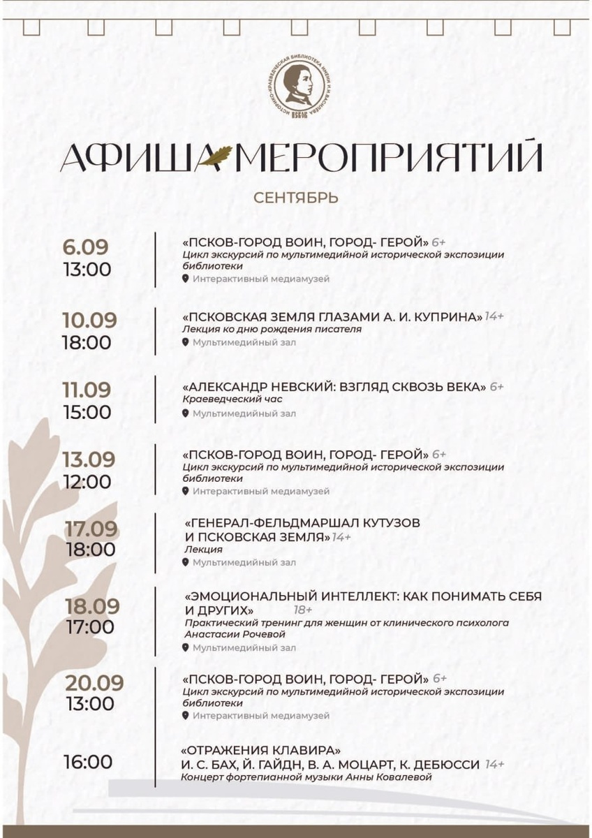 В сентябре библиотека им. Василёва организовала множество интересных мероприятий ✨ Не упустите шанс посетить: 🛡 Историческое погружение: мультимедийная экскурсия «Псков — город воин, город-герой» пройдёт 6, 13, 20 и 27 сентября. ⚔️ Имена и легенды: лекции, посвящённые связям великих людей с псковским краем, расскажут об Александре Невском, А.И. Куприне и генерале Кутузове. 📜 Основное событие месяца — фестиваль «Книжная яблоня», который пройдёт с 24 по 27 сентября! 🪶 Гостей ждут творческие встречи с известными российскими писателями (Антонина Крейн, Нина Грай, Баир Ириничев), стендап и квартирник. Это уникальная возможность пообщаться с авторами вживую. 🎼 Искусство и музыка: 20 сентября состоится концерт фортепианной музыки «Отражения клавира», где прозвучат произведения Баха, Моцарта и Дебюсси. Оставайтесь с нами #НашаПсковскаяобласть
