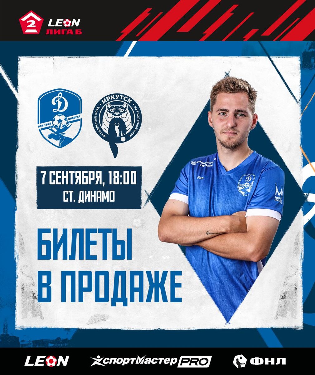 Следующий домашний матч сыграем 7 сентября в 18:00 с «Иркутском»⚡ Билеты на встречу уже в продаже! Успей взять любимые места на стадионе «Динамо» уже сейчас: clck.ru/3NtjsE 🎫 Ждём поддержки каждого динамовца в первом домашнем матче осени! 💙 @dynamovologda