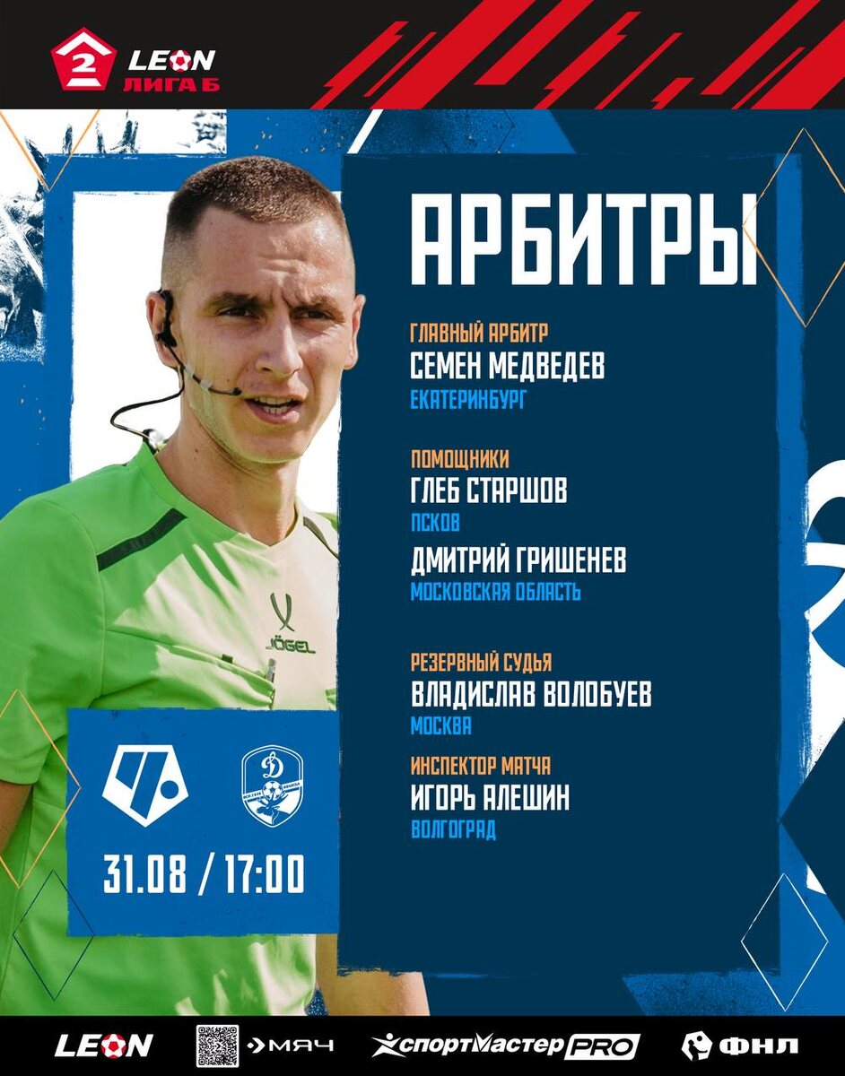 ⚡Семён Медведев из Екатеринбурга — главный арбитр матча с «Чертаново» Встреча 21-го тура первенства LEON Вторая Лига Б пройдёт 31 августа на стадионе «Арена Чертаново» в 17:00. @dynamovologda