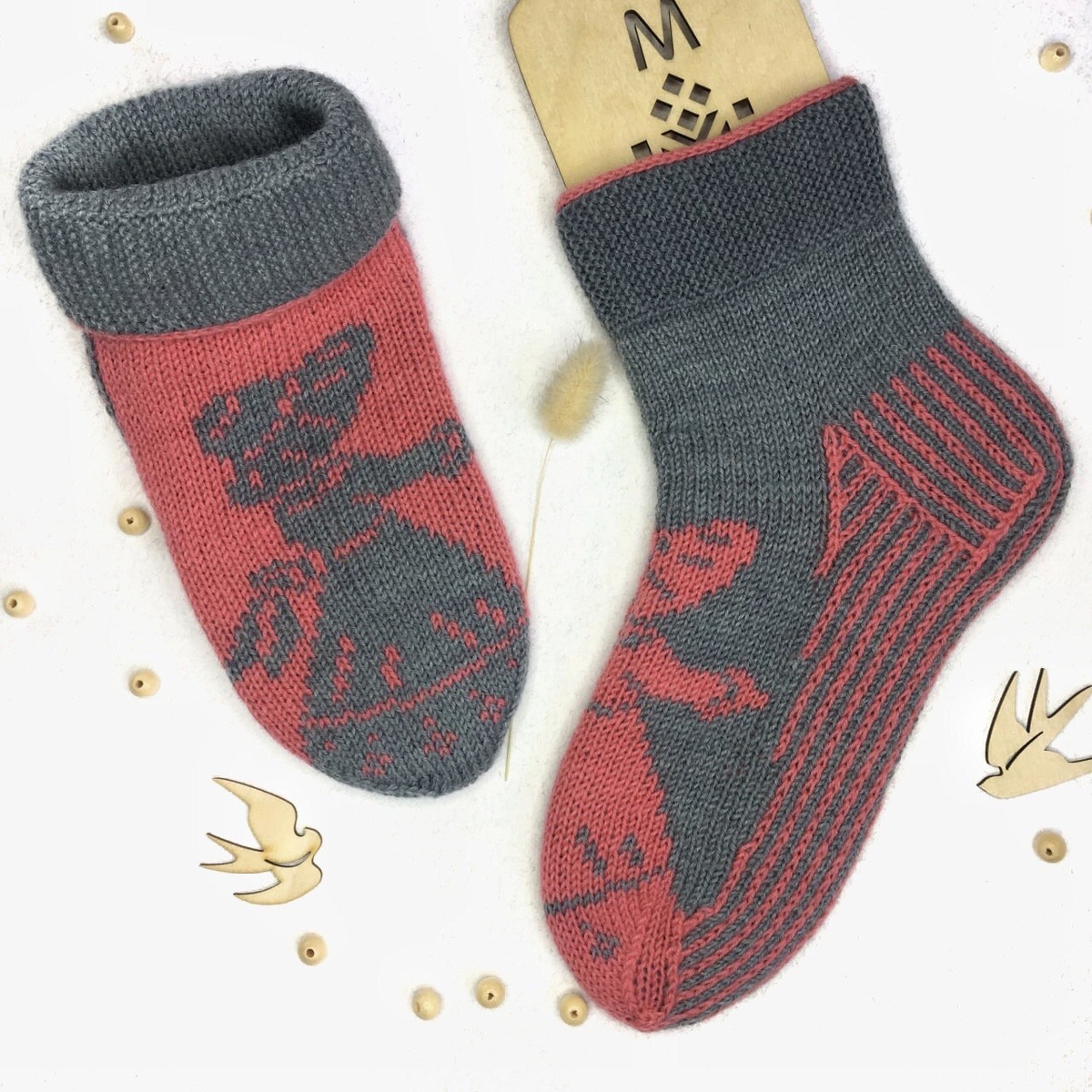 Две пары носков при вязании одной. Как это возможно? Получается такое при вязании техникой двустороннего жаккарда. Носочки не имеют изнанки, потому что их можно носить на обе стороны. По факту, визуально, получается 2 пары носков. Наскучила одна расцветка - вывернули на изнаночную сторону - и готовы новые носочки. Процесс вязания, конечно, сложнее, чем у обычных односторонних. И временные рамки в два раза больше, и техника исполнения немного отличается. Но результат того стоит! В качестве рисунка можно выбрать любую картинку, логотип, инициалы. Или подобрать изображение по теме профессии. На выходе получится идеальный подарок для близкого человека или коллеги. Так как носки получаются двойные, они очень теплые. Их можно носить на даче, даже в холодное время года. Можно использовать вместо домашней обуви. Помните, что презент, выполненный своими руками - дорог вдвойне? У меня есть МК на носки, выполненные в технике двустороннего жаккарда. Кому интересна эта тема - приходите и приобретай