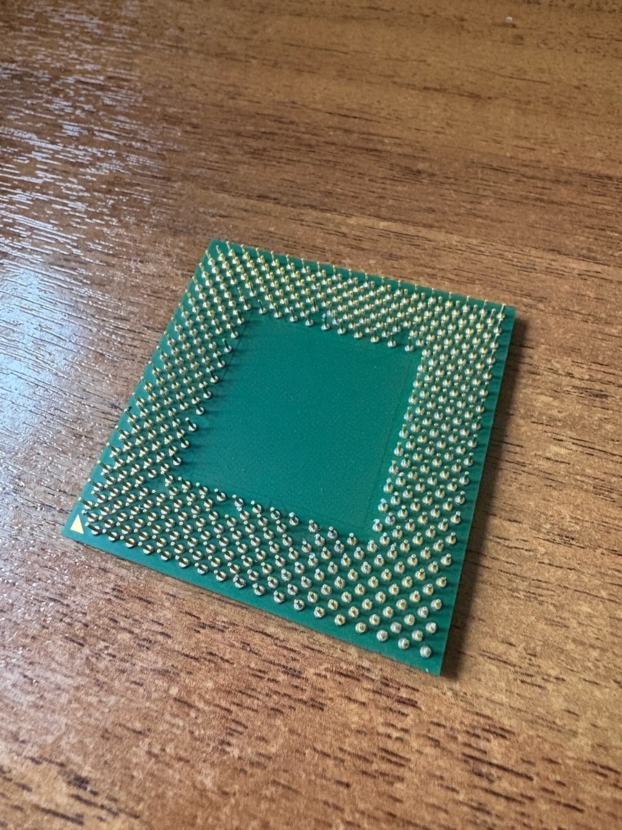 На фото выше — процессор в форм-факторе PGA (Pin Grid Array). Ножки (пины) аккуратно расположены по периметру, а в центре пустое пространство — именно так выглядели многие чипы того времени. Такой форм-фактор отличался от современных LGA (Land Grid Array), где ножки находятся на материнской плате, а не на процессоре.