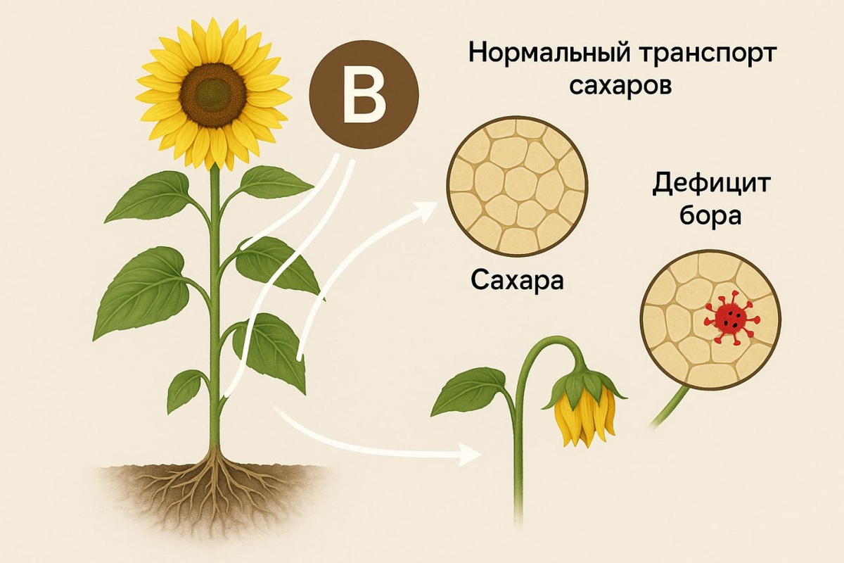 🔤 Бор - элемент управления проводящей системой растений Бор в первую очередь ассоциируется с опылением и завязью, но его роль гораздо шире. 🔬 При достаточном обеспечении бором сосудистая система растений работает «как по рельсам»: сахара и другие ассимиляты свободно перемещаются по флоэме, обеспечивая энергией точки роста и репродуктивные органы. 👉 При дефиците бора: ⚠️ нарушается транспорт сахаров — углеводы накапливаются в листьях, а репродуктивные органы остаются «голодными»; ⚠️ например, у подсолнечника это приводит к пустоцветам и снижению числа завязей; ⚠️ повреждается целостность сосудов, что облегчает распространение вирусных инфекций по флоэме. 📌 Важно понимать: бор — это не только микроэлемент питания, но и фактор фитосанитарной устойчивости. ⚡️ Для практики: ⚠️ Бор особенно критичен для культур с высокой потребностью в сахарах (подсолнечник, свёкла, рапс). ⚠️ Внесение бора в фазу бутонизации и цветения снижает риск пустоцвета и одновременно повышает устойчивость