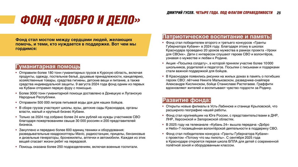 Фонд «Добро и Дело»: вместе делаем больше Хочу выразить искренние слова благодарности руководителю фонда «Добро и Дело» Анне Потынга. Благодаря её энергии и самоотверженности фонд стал одним из ключевых центров гуманитарной помощи и патриотического воспитания на Юге России. 🗓 В 2025 году фонд продолжает активно развиваться: ✔️ открыты новые филиалы в Усть-Лабинске и станице Крыловской, что расширило географию работы; ✔️ фонд стал крупнейшим на Юге России, с представительствами в ДНР, ЛНР, Херсонской и Запорожской областях; ✔️ выигран конкурс «Гранты губернатора Кубани» с проектом «Потому что мы пилоты» — в Краснодаре откроется первая школа БПЛА для детей с современной полётной зоной и оборудованным классом; ✔️ с сентября 2025 года стартует новый образовательный проект по подготовке юных пилотов; ✔️ на телеканале «Кубань 24» вышла передача «Добро и Небо», посвящённая волонтёрской работе фонда и поддержке СВО. Фонд «Добро и Дело» — это тысячи людей, которые объединились ради одной це