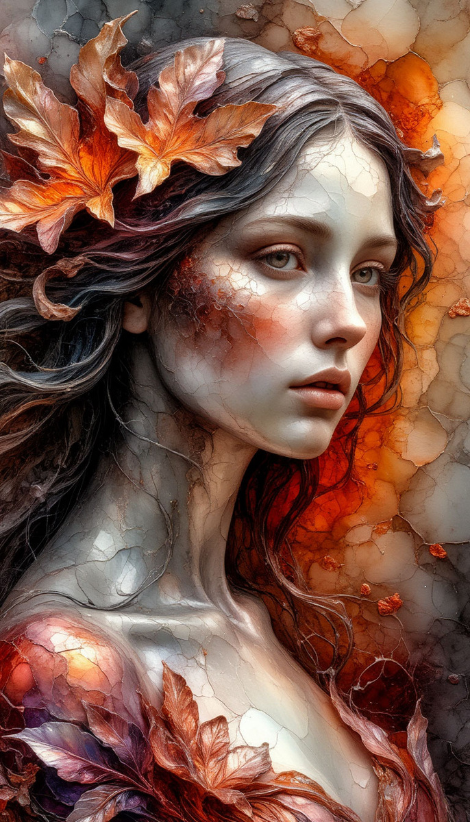 Дева смотрит среди странных узоров из горячего венецианского цветного стекла, дымка, 3 D, перламутровый фон цвета серебра с золотом, нежность и красота, образы сердечек и красивых листьев, великолепие глаз