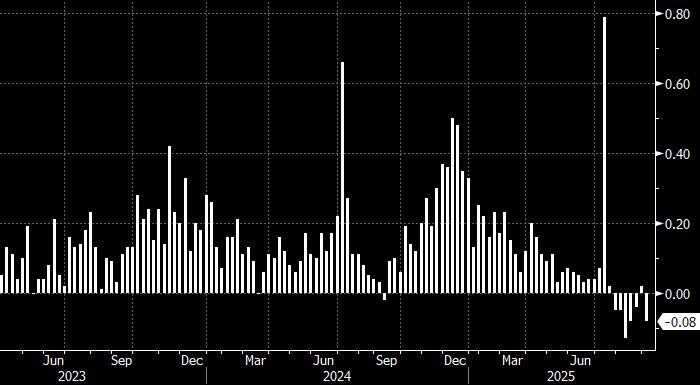 На неделе до 1 сентября потребительская инфляция в России снизилась на 0,08% н/н после роста на 0,02% н/н в предыдущий отчетный период, сообщает Росстат. С начала года накопленный показатель составил 4,10%. Потребительская инфляция в России в базисе неделя к неделе На неделе до 1 сентября потребительская инфляция в России снизилась на 0,08% н/н после роста на 0,02% н/н в предыдущий отчетный период, сообщает Росстат. С начала года накопленный показатель составил 4,10%. Таким образом, в страну вернулась недельная дефляция. Годовая инфляция в РФ, по оценкам Минэкономразвития, замедлилась на неделе до 1 сентября до 8,28% с 8,43% неделей ранее. «За период с 26 августа по 1 сентября 2025 г. цены изменились: на говядину, баранину и сахар-песок +0,4%, сосиски, сардельки, яйца куриные и консервы мясные для детского питания +0,3%, свинину, мясо кур, колбасы полукопченые и варено-копченые, муку пшеничную, макаронные изделия, крупу гречневую, маргарин и обеды в столовой, кафе, закусочной (кроме ст