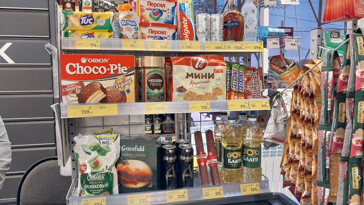 Всех приветствую, мои дорогие друзья и подписчики. Покажу вам витрину у кассы в Магните у дома с товарами со скидкой по карте. Магазин находится по адресу Ростовская область, Зерноградский район, станица Мечётинская ,улица Ленина, 52. Крекер со сметаной и луком хрустающий TUC 100 г цена 74,99 рублей . Пюре Агуша фруктовое яблоко/ежевика/малина 90 г цена 39.99 рублей . Капсулы для стирки Персил Колор 10 шт цена со скидкой по карте 199.99 рублей . Зубная паста Колгейт тройное действие 150 мл цена со скидкой по карте 159.99 рублей . Вино игристое Лапетитперле белое экстра брют 0.25 л ж/б цена 169.99 рублей . Коньяк Коктебель трехлетний 40 % 0,5 л цена со скидкой по карте 724.99 руб. Водка Белая Березка 40% 0.375 л цена 379.99 рублей . Батончик Сникерс Лесной орех 81 г цена 69.99 рублей . Тульский пряник с начинкой вареная сгущенка 140/130 г ( ТФ Ясная поляна ) цена со скидкой по карте 44.99 рублей . Кофе Нескафе Голд Арома Интенсо сублимированный растворимый 170 г цена со скидкой п