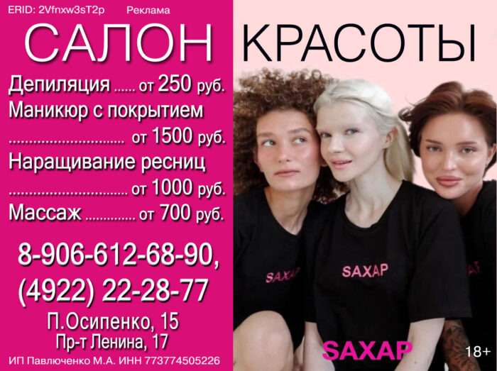 Сеть «Марлен/Saxap» – это уже 93 салона красоты в 23 городах России, в том числе и во Владимире. Во Владимире открыты 2 филиала салона красоты: Полины Осипенко, д. 15Проспект Ленина, д. 17 Тот самый салон с 🔝качеством услуг. Каждый месяц для наших клиентов мы проводим акции* – создаем индивидуальные предложения на основе ваших предпочтений и потребностей. Постоянно действующая акция* – скидка 10 % NEW-клиенту. Уже много лет мы радуем своих клиентов высоким качеством и самыми доступными ценами в городе Владимире. Необходимые материалы и оборудование мы закупаем в больших объемах, чтобы обеспечить слаженную работу наших салонов. Это важный факт, который позволяет сохранять приятные цены для клиентов. Наши высоко квалифицированные мастера имеют большой опыт работы и готовы создавать красоту для любимых клиентов. Наши акции* и скидки* не могут оставить вас равнодушными, а главное наши салоны предоставляют весь спектр услуг** в beauty-сфере: ▫️ сахарная депиляция