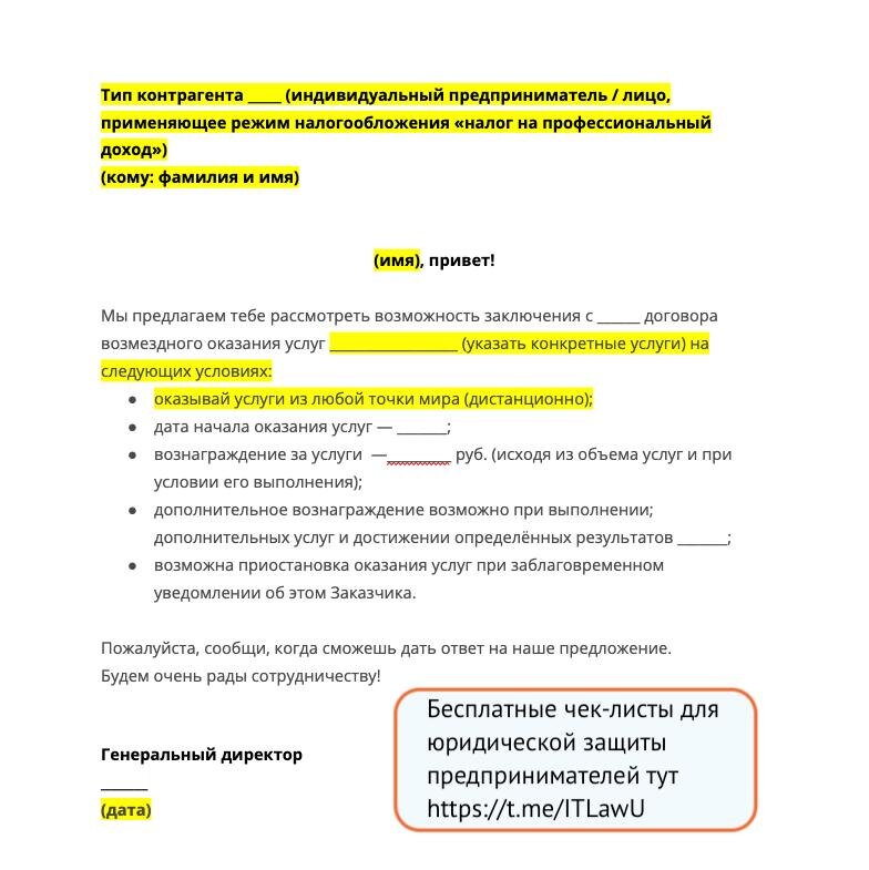 ⚠️Как предложение о работе самозанятому может обернуться штрафами. 5 инструментов, чтобы обезопасить себя Спасибо всем, кто проголосовал в предыдущем посте! ⚡️ Вижу, что многие уже подкованы в работе с самозанятыми и верно ответили, что риски, конечно, есть. 🏆 А теперь разбор: в оффере из этого сообщения для самозанятого действительно есть риски для компании-заказчика. 📌 Что именно несет риски в том оффере: — Упоминание «команды» и «должности» — звучит как трудовые отношения. — Фраза «Х рублей ежемесячно» — похожа на зарплату, а не оплату услуг по факту оказания. — «Отгулы» и «отпуск» — 100% признаки трудового договора. — Скидки на услуги компании и бонусы — социальные гарантии, тоже характерны для найма. ⚠️ Всё это может привести к переквалификации отношений в трудовые, а значит: Налоговые доначисления 43% от выплат + штраф 50% от недоплаченных налогов и взносов + пени (а крупным компаниям и главбухам даже риск уголовной ответственности). Вот тут можете подробно посмотреть мой в