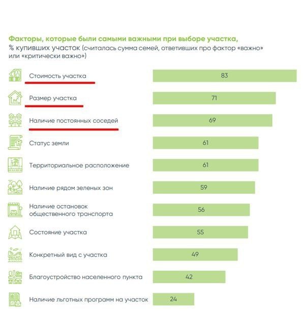 🍃 Осень — это не только время сбора урожая, но и период подведения итогов уходящего года. В недвижимости это тоже актуально. Пока снег не укрыл землю, сентябрь, октябрь и даже ноябрь — отличное время для выбора загородной недвижимости. Осенью растительность редеет, и становятся видны все особенности местности. Дожди помогают оценить, насколько сухой участок и как работает система дренажа, если она есть. В пасмурные дни осень выявляет все недостатки вашего выбора. Поэтому в более благоприятный сезон ваша загородная недвижимость будет радовать вас еще больше. Хочу поделиться аналитикой от финансового института «ДОМ.РФ». Хотя я редко доверяю сторонним исследованиям, в этот раз цифры кажутся максимально близкими к реальности. Опрос показал, что при выборе участка люди обращают внимание на следующие факторы: • Стоимость (83%) • Размер участка (71%) • Наличие соседей (69%) • Статус земли (61%: ИЖС, ЛПХ, дачный кооператив и т. д.) • Территориальное расположение (61%) ⬇️ Ключевые фа