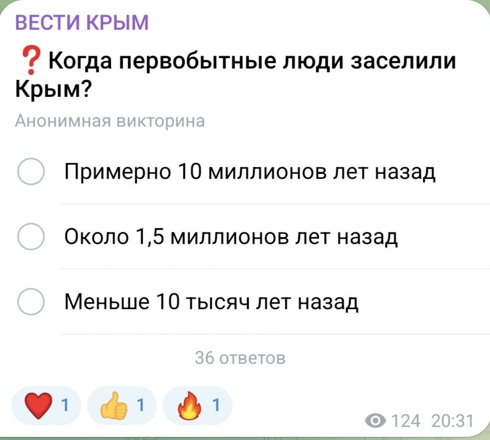 Оригинальную викторину проводят "Вести Крым". Оригинальность данной викторины в том, что, имхо, верного варианта ответа там нет :) Если у нас на канале присутствуют люди с "Вестей" - может быть, объясните суть викторины? :)