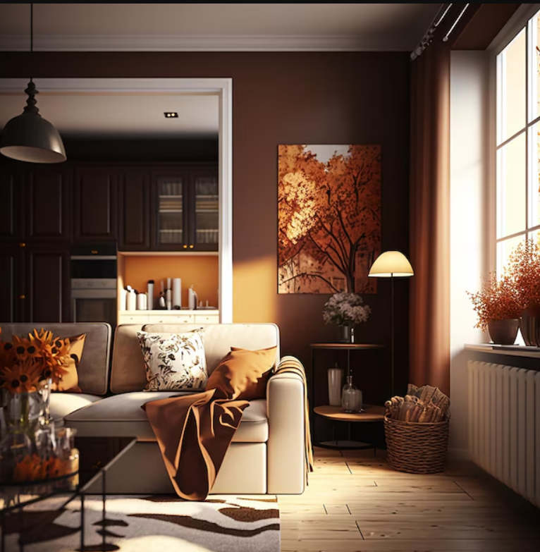 - Землистые оттенки. Это фундамент осенней палитры. Все вариации коричневого — от мягкого песочного и теплого бежевого через умбру и сиену до глубокого шоколадного и почти черного кофе — олицетворяют почву, кору деревьев, опавшую листву. Эти цвета несут в себе ощущение стабильности, надежности и фундаментальности. Они «заземляют» интерьер, делая его основательным и спокойным.