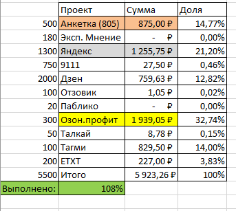 Последний летний месяц стал неоднозначным для моего хобби - заработка в Интернете. С одной стороны, я смог перевыполнить план по доходам, с другой - окончательной разочаровался в блогосфере. Тут хочу несколько извиниться перед своими читателями за паузу в публикациях. К сожалению, свободного времени не было от слова "совсем". Основная работа, тестирование новых площадок отнимали много времени. А выходные дни я все проводил у родителей в деревне - копали картошку. Как назло, с недавнего времени в центре Екатеринбурга стали отключать Интернет с 23:45 до 05:00. Я, конечно, рад, что власти заботятся о здоровом сне граждан, но я часто писал статьи по ночам) Но перейдем к итогам августа 2025 года. Я вновь сделал план на месяц 5500 рублей. И на этот раз его перевыполнил! За месяц удалось заработать 5923,26 рублей. Но какой ценой! 1. Озон.Профит - 1939,05 рублей. Полная неожиданность этого месяца. На Озоне можно хорошо зарабатывать. Если есть пул удобных заданий. Во второй половине месяце нео