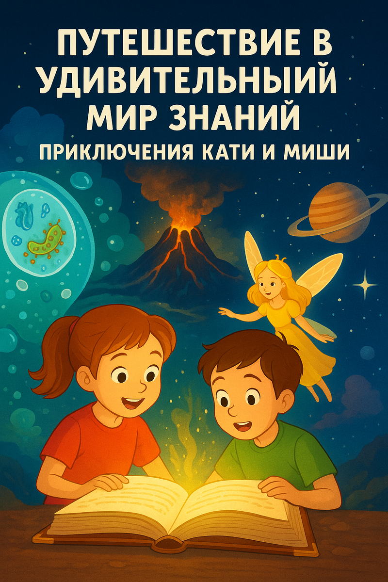 Однажды вечером, когда за окном шумел дождь, а дома было тепло и уютно, брат и сестра — Катя и Миша — сидели за столом и рассматривали старую книгу с золотыми узорами на обложке. — Смотри, — сказала Катя, — эта книга похожа на волшебную. И в тот же миг книга вдруг засветилась мягким светом, страницы зашелестели, и ребята услышали тихий голос: — Хотите отправиться в путешествие по удивительному миру знаний? Миша и Катя переглянулись и хором ответили: — Хотим! В одно мгновение они очутились в другом мире. Всё вокруг казалось огромным: капля воды была величиной с озеро, а на её поверхности плавали крошечные существа с длинными хвостиками. — Добро пожаловать, — сказала невидимая до этого фея Знаний. — Это микромир! Здесь живут бактерии, амёбы и другие микроскопические жители. Катя удивлённо воскликнула: — Так вот кто прячется в каждой капельке воды! Фея объяснила, что эти крошечные создания бывают разными: одни приносят пользу, помогая человеку, а другие могут вызывать болезни. Следующа