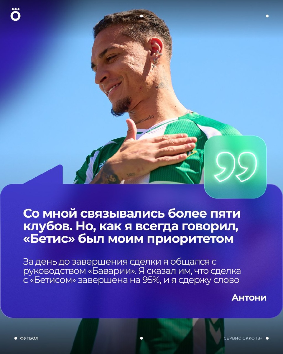 Антони рассказал, что отказался переходить в «Баварию» 🙅🏻♂️ Любовь к «Бетису» оказалась сильнее 💚