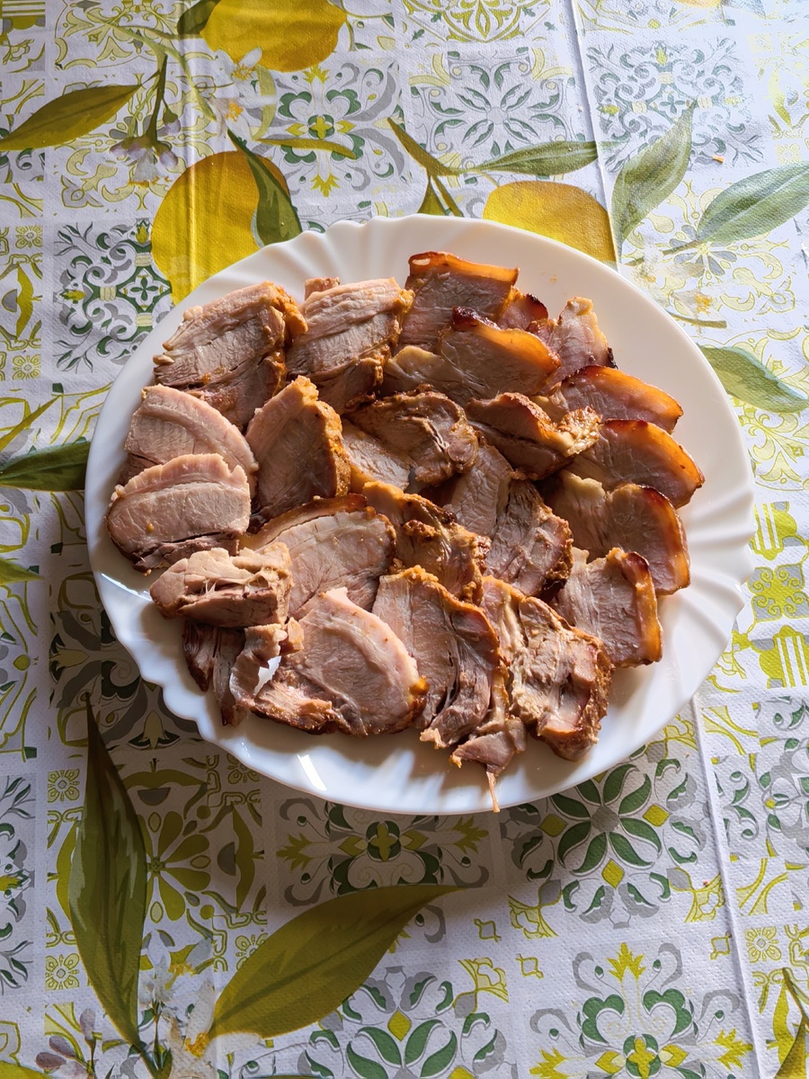 Грудинку таким способом я готовлю уже много лет. Такая грудинка может стать отличной заменой копченого мяса и отлично подойдёт в качестве нарезки на праздничный стол. В горячем виде грудинка тоже очень вкусная, может стать отличным обедом или ужином. Свиную грудинку промыть, обсушить бумажным полотенцем. Посолить со всех сторон (слегка). Отдельно смешать майонез или сметану 2 ст. л. , аджику (по вкусу, у меня 1 ч.л.), кетчуп или томатную пасту 1 ст.л., сухой чеснок и соль (немного, по вкусу; не бойтесь, пересоленная не будет!) Всё хорошо перемешать. Обмазать со всех сторон. Завернуть в фольгу так, чтобы при запекании можно было приоткрыть. Оставить в тепле на 20 - 30 минут. После запекаем в духовке. Сначала 1 час 20 минут в закрытой фольге, затем открыть фольгу и запекать до румяности (у меня заняло 35 минут, но это время зависит от вашей духовки). Сразу же после запекания завернуть грудинку в новую фольгу, дать остыть. После убираем в холодильник минимум на 2 - 3 часа, макс
