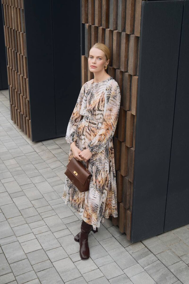 TREND: ANIMAL PRINT Ищете эффектный и женственный образ? Благодаря романтичному крою и анималистичному принту, сочетанию женственности и страсти, такое платье точно не оставит никого равнодушным! Мы предлагаем сочетать платье с высокими кожаными сапогами и классической коричневой сумкой — идеальный лук для начала осени в самых трендовых оттенках.