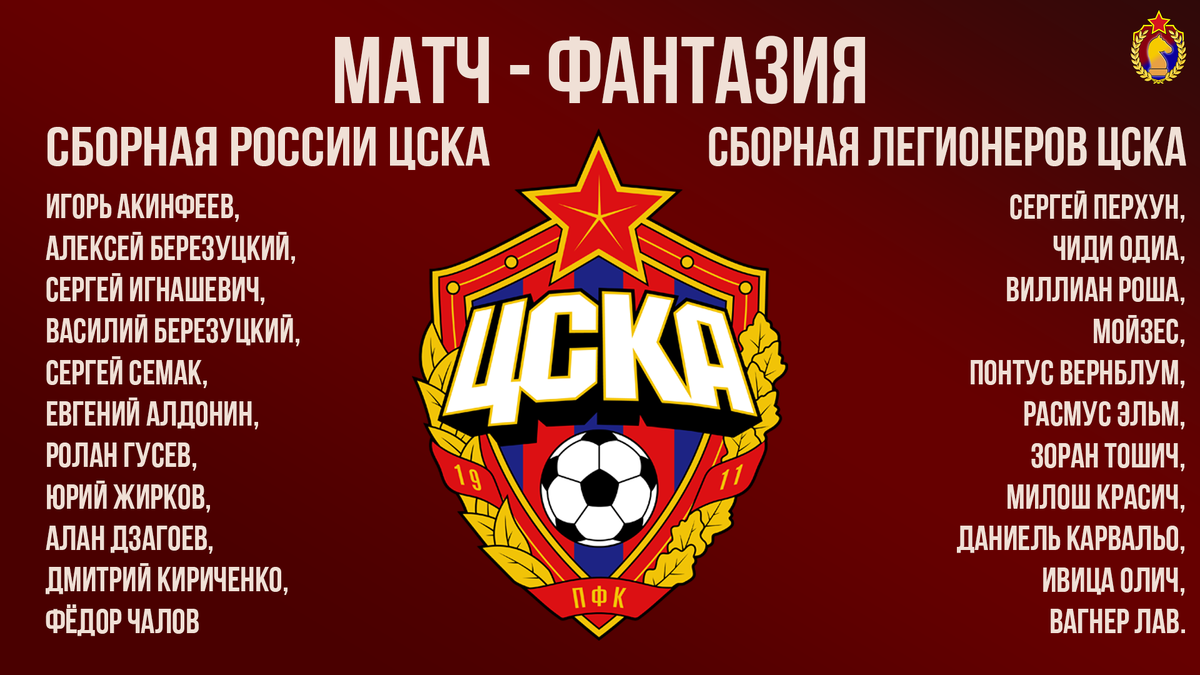 На «ВЭБ Арене» состоялся уникальный матч-фантазия: сборная ЦСКА из российских игроков против сборной легионеров клуба. Это дружественный матч – в самом прямом смысле этого слова! Составы: Игорь Акинфеев — символ клуба, человек-эпоха, главный страж ворот армейцев. Алексей и Василий Березуцкие, Сергей Игнашевич — легендарная тройка, основа обороны золотой эпохи. Сергей Семак — капитан и лидер команды середины 2000-х, универсал, способный решать исходы матчей. Евгений Алдонин — опорник, обеспечивавший баланс между обороной и атакой. Ролан Гусев — фланговый мотор, быстрый и трудолюбивый, с потрясающими навесами. Юрий Жирков — креатив, дриблинг и невероятная работа на левом фланге. Алан Дзагоев — символ созидания и фантазии в полузащите. Дмитрий Кириченко — форвард, который всегда оказывался в нужном месте в нужное время. Фёдор Чалов — представитель нового поколения. Сергей Перхун — отдельная история. Язык не поворачивается назвать его легионером! Но поскольку все вратари в истории ЦСКА был
