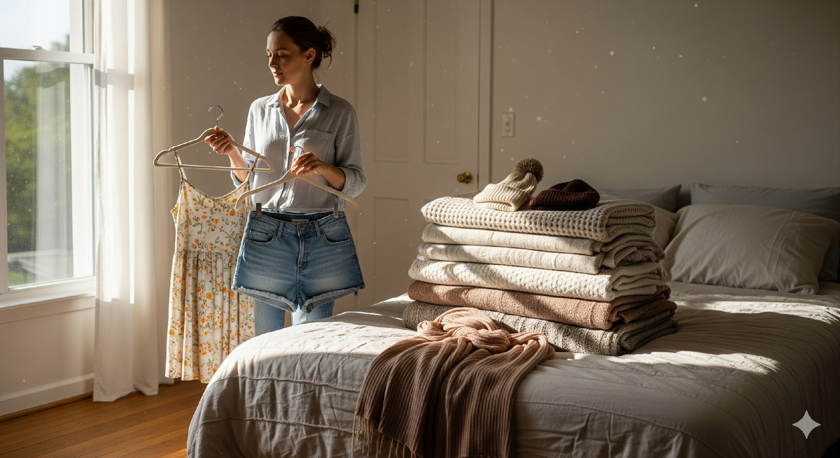 Все лёгкие сарафаны и рубашки сложите, оцените, что стоит оставить, а что можно отдать или выбросить. На полки — уютные свитера, шарфы, куртки — пусть будут под рукой.
