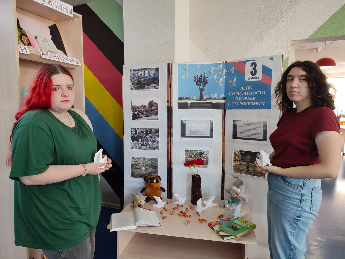 В Центральной библиотеке прошла выставка-реквием, посвященная Дню солидарности в борьбе с терроризмом. Библиотекарь Елизавета Булатова напомнила читателям о трагедии, произошедшей 1 сентября 2004 года в школе №1 города Беслана. Невозможно стереть из памяти горе, случившееся накануне нового учебного года. Вспоминается цитата из книги «Форпост. Беслан и его заложники»: «И если в Освенциме надо побывать, чтобы знать о Холокосте, то в бесланской школе надо побывать, чтобы увидеть лицо терроризма». Прошло два десятка лет, но мы должны помнить об этой трагедии и сделать все, чтобы она не повторилась. Каждый читатель получил памятку-буклет об антитеррористической безопасности.