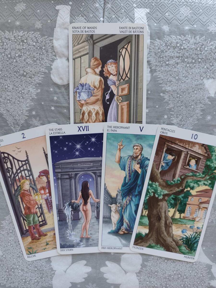 Будь то встреча с человеком, который подарит тепло и внимание (2 кубков + Звезда), или возможность реализовать что-то важное с поддержкой семьи, наставника или партнёра (Иерофант + 10 пентаклей).