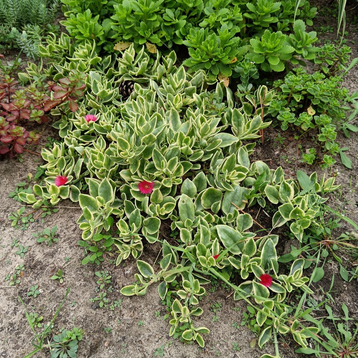 Аптения вариегатная в саду - эффектный суккулентный почвопокровник. Очень гармонично вписалась в яркую компанию седумов.