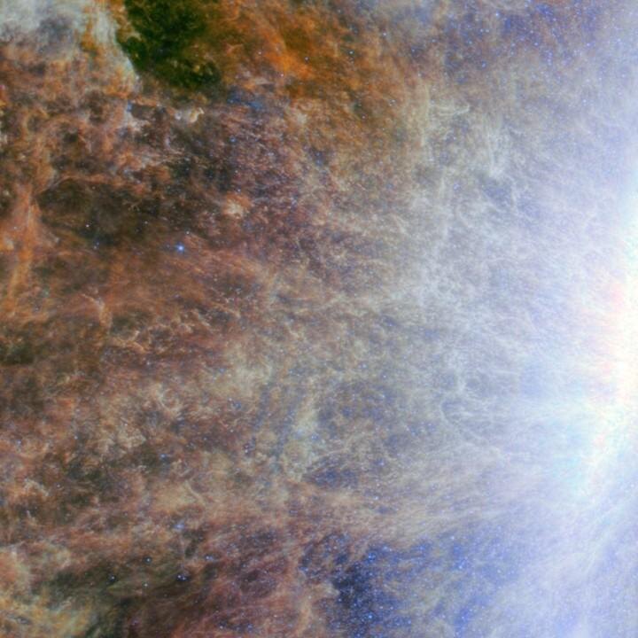 Ты слишком яркая! Перед вами галактика Мессье 82, запечатлённая телескопом НАСА Webb. Несмотря на то, что она меньше нашего Млечного Пути, она в пять раз ярче. Более того, Мессье 82 формирует звёзды в десять раз быстрее, чем наша галактика, что относит её к классу звёздных взрывных галактик. Внутри Мессье 82 находятся свыше 100 сверхзвёздных скоплений, каждое из которых содержит сотни тысяч звёзд. Эти скопления отличаются более высокой массой и светимостью по сравнению с обычными звездными группами. На изображении яркое узкое белое свечение холодного оттенка пронзает центр кадра, окружённое богато текстурированными облаками серой и ржаво-красной пыли. На фоне видны едва различимые синие звёзды.