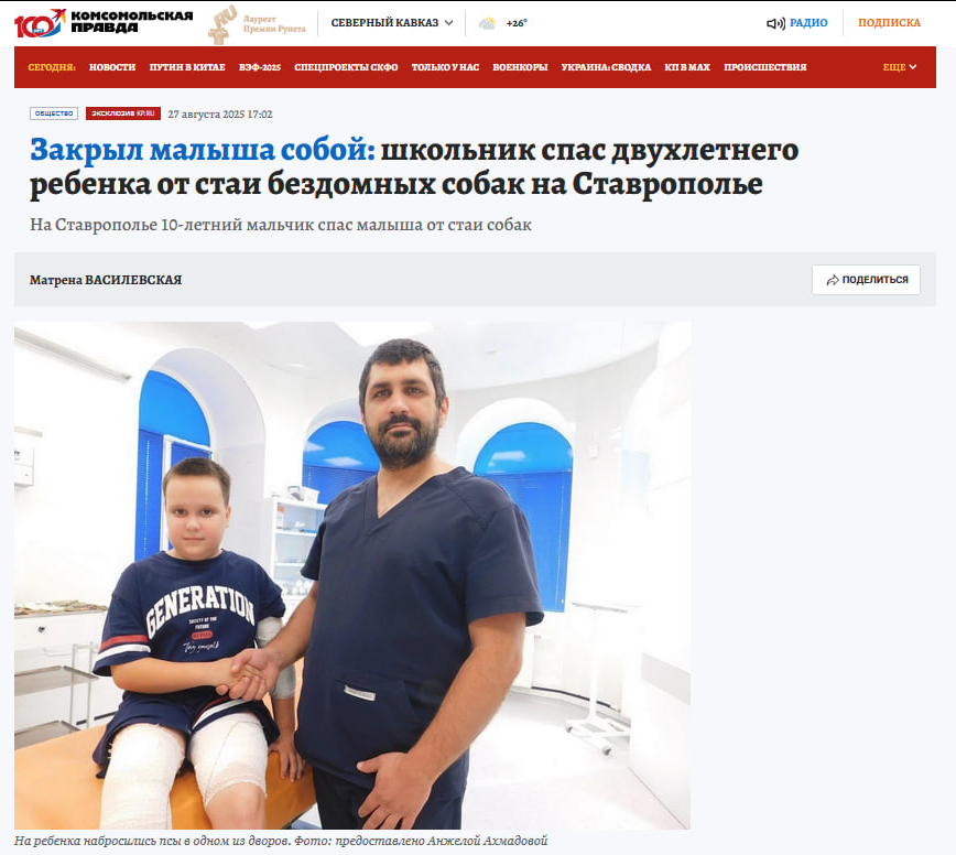 Вы только вдумайтесь в смысл этого новостного заголовка: «В Ставрополье десятилетний мальчик спас двухлетнего ребёнка от стаи бродячих собак, закрыв его своим телом!»