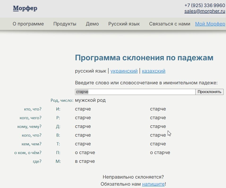 А как насчёт «Мам!», «Пап!», «Боже!»? Зашел на наш отечественный сайт Морфер. Программа «Морфер» предназначена для склонения слов и словосочетаний на русском языке. Учитывает множество синтаксических конструкций, включая ФИО и произвольные именные словосочетания. Вставил в окошко слово «Старче» и вот что получил. Со словами «Господи», «Княже» произошло то же самое. То есть эти слова не склонялись!!! Так вот - это пример ЗВАТЕЛЬНОГО ПАДЕЖА, или, как его ещё называют, седьмого падежа русского языка. Когда-то в русском языке было семь падежей. Шесть из них мы все знаем: именительный, родительный, дательный, винительный, творительный, предложный. А седьмой — звательный — возникает в моменты искреннего обращения, когда душа требует не просто сказать, а позвать. Вы когда-нибудь задумывались, почему, окликая близкого человека, мы не говорим «Мама, подойди!», а почти инстинктивно произносим: — Мам!
