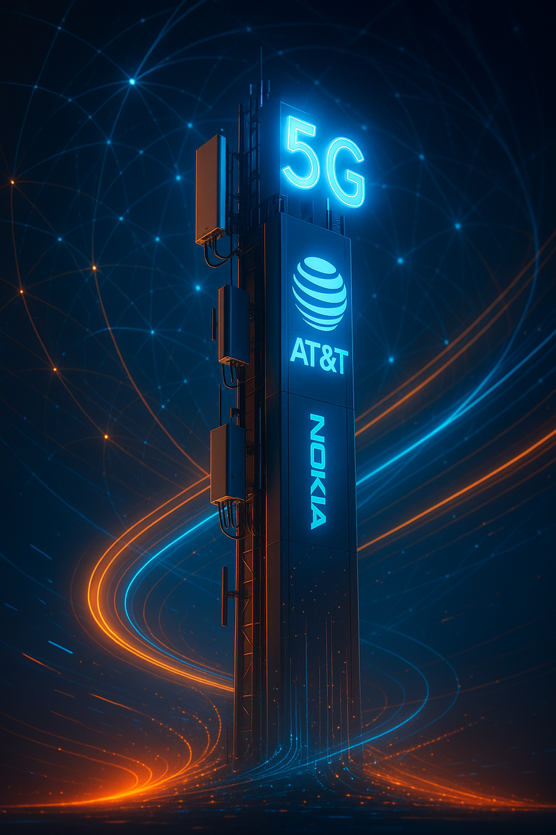 Nokia 5G-башня с логотипом AT&T и футуристическими сетевыми соединениями