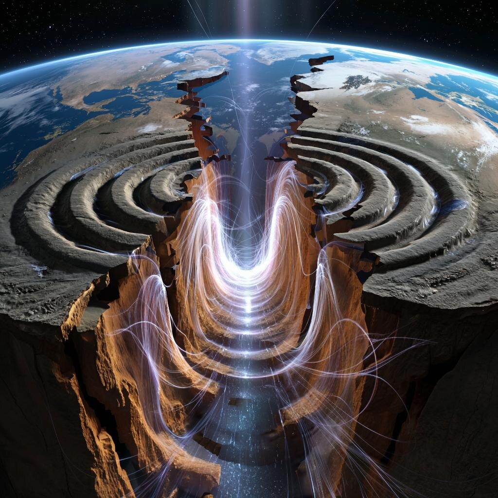 Формирование веретена деления: параллельно с движением континентов в литосфере и верхней мантии происходит формирование системы упорядоченных, стабильных каналов, обогащенных каталитическими металлами (никель, железо, платина, палладий). Эта сеть, пронизывающая планету вдоль экваториальной плоскости, представляет собой протоверетено деления. Оно является результатом многовекового геологического структурирования, направляемого тектоническими силами. Его функция — стать проводником и фокусатором энергии в момент деления, обеспечив симметричное расхождение масс.