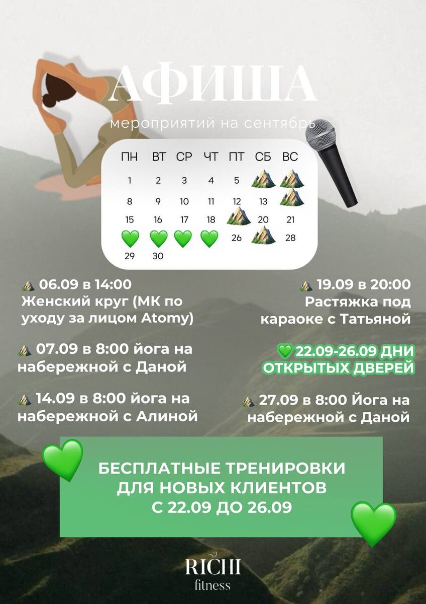 💚 АФИША СЕНТЯБРЯ в RICHI Осень обещает быть яркой и вдохновляющей! Вот что ждёт вас в сентябре: – 06.09 | 14:00 — Женский круг. Мастер-класс по уходу за лицом с Atomy – 07.09 | 8:00 — Йога на набережной с Даной – 14.09 | 8:00 — Йога на набережной с Алиной – 19.09 | 20:00 — Растяжка под караоке с Татьяной – 22–26.09 — Дни открытых дверей. Все тренировки бесплатны для новых клиентов – 27.09 | 8:00 — Йога на набережной с Даной Сентябрь — это отличный повод попробовать что-то новое и наполнить себя энергией! Запись обязательна: http://n882474.yclients.com/ Ждем вас в RICHI 🫶🏻