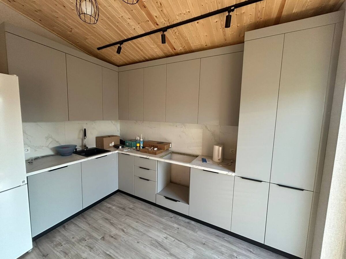 Только что закончили установку этой кухни, поэтому фото «с пылу с жару» — ещё даже не успели навести красоту