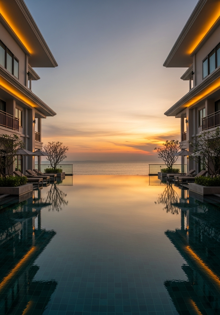 - длинный бассейн с видом на закат;
