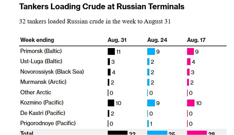 И если говорить о Bloomberg и нефти, то можно заглянуть в их еженедельный отчёт про экспорт российской нефти. Есть три фактора, которые могли повлиять на падение: ▪️Удары ВСУ по нефтяной инфраструктуре; ▪️Пошлины Трампа; ▪️Санкции ЕС. В аналитике только морские поставки, они не учитывают поставки по нефтепроводам, поэтому падение экспорта в Венгрию и Словакию после ударов по «Дружбе» нигде не отражено. Однако через «Дружбу» нефть так же поставляется в Усть-Лугу, где загружается на танкеры, и вот там падение есть. Однако видно, что за неделю в конце августа два лишних танкера загрузили в Приморске, видимо нефть удалось перенаправить. Общий экспорт сохраняется примерно на одном уровне, хотя на дистанции Индия снизила закупки, а Китай немного нарастил. Однако снижение закупок Индией связано не с санкциями Трампа, а с санкциями ЕС. Точнее даже не санкциями, а с запретом с января закупать бензин, сделанный из российской нефти. Индия же, в отличие от Китая, покупает российскую нефть для