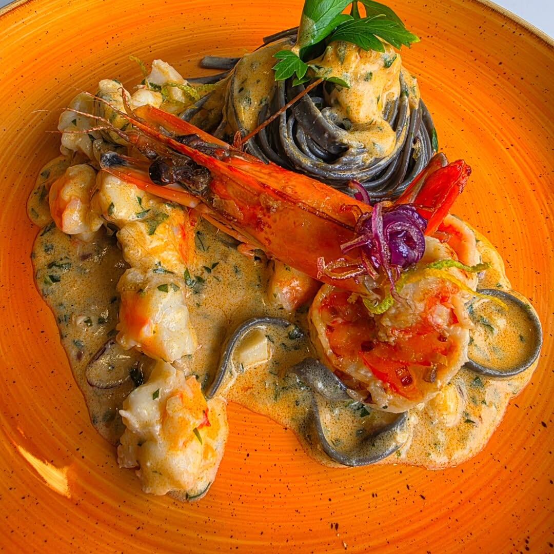 Ингредиенты: - свежая петрушка - паста из сепии - немного пасты - сок и цедра лимона - немного сливок или молока - 2 мл коньяка - перец, нарезанный полосками и кубиками Приготовление: Очистите креветки и нарежьте их крупными кусочками. Если используете их в качестве гарнира, опустите головки в кипящую подсоленную воду на несколько минут, чтобы они приобрели яркий красный цвет, оставаясь при этом прозрачными. Нарежьте другую часть креветок соломкой и слегка обжарьте на сковороде с небольшим количеством масла и сока лимона, затем отложите в сторону. Отварите пасту из сепии в подсоленной воде до состояния аль денте. Добавьте нарезанные кубиками креветки и цедру лимона в сковороду с обжаренными креветками, быстро обжарьте все ингредиенты со всех сторон и уберите с огня, чтобы креветки не пережарились. Оставьте их слегка недоготовленными. Влейте молоко или сливки, добавьте коньяк, поставьте на огонь и добавьте немного пасты. Дайте соусу немного покипеть, затем добавьте нарезанную петрушку.