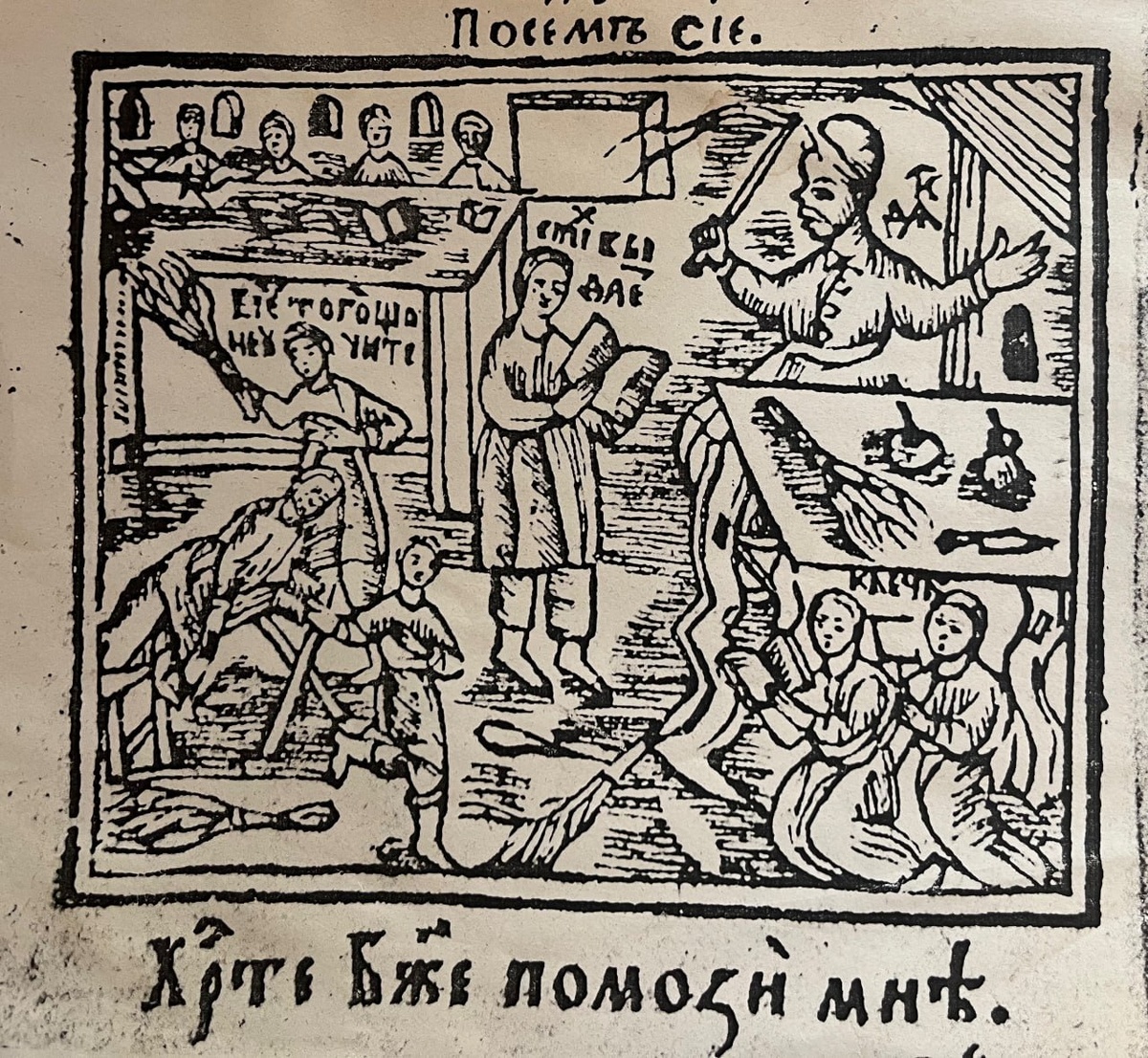 На гравюре мы видим процесс обучения: дьяк с плетью слушает ученика, который "стих выдает" - читает Псалтырь, слева - телесные наказания: "Бьет того, що не учит".