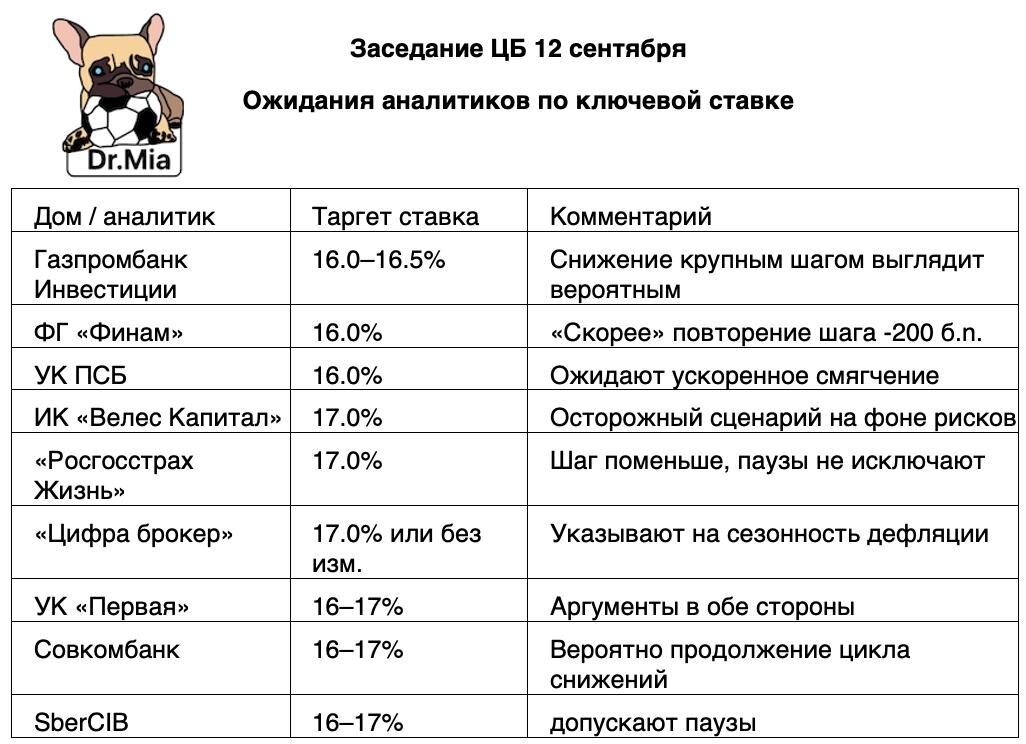 Давно не писал о фьючерсе $RBZ5 на индекс RGBI который держу, пора сделать апдейт. 📌 Доходность гособлигаций связана с ключевой ставкой. Ближайшее заседание 12 сентября. ❓С чем мы сейчас подходим к нему? 🔹 Инфляция (опубликовали сегодня) • Недельная инфляция: дефляция −0,08% (26.08–01.09). • Годовая инфляция: замедлилась до 8,28%. 🔸 Новостной индекс (за август, опубликовали сегодня): 1,04 после 1,09 в июле — близко к среднему за 12 мес. и заметно выше среднего за 5 лет ⇒ активность остаётся высокой. ⬇️ Сдерживали индекс: замедление ВВП во II кв., слабость промышленности, рост скрытой безработицы/неполной занятости, снижение цен на часть экспортных товаров и внешние риски (пошлины США, слабее настроения в Китае). ⬆️ Поддерживали: последовательное замедление роста потребительских цен, высокая инвестактивность в 1П25 и расширение добычи в рамках квот ОПЕК+. ❓❗️Что «предсказывают» аналитики разных брокеров? Основное - снижение ключевой на 100–200 б.п. При этом большинство склон