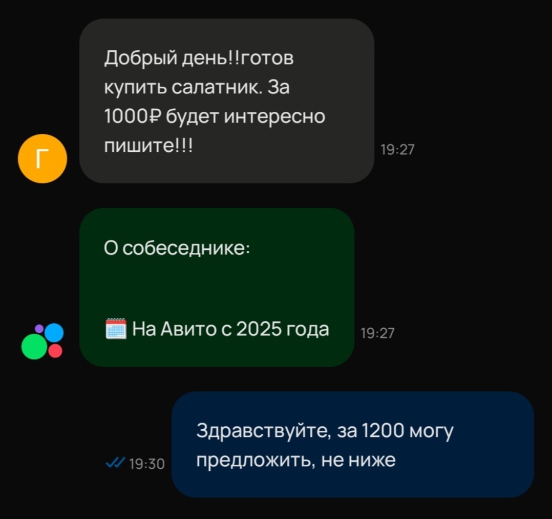 Под конец переписки я ему уже не отвечала, но он продолжил с утра. Уверял, что попробует и если не получится оформить онлайн, то я могу товар продавать дальше)) Но мне на радость мой салатник выкупили доставкой уже рано утром, до его великодушного сообщения и Слава Богу.